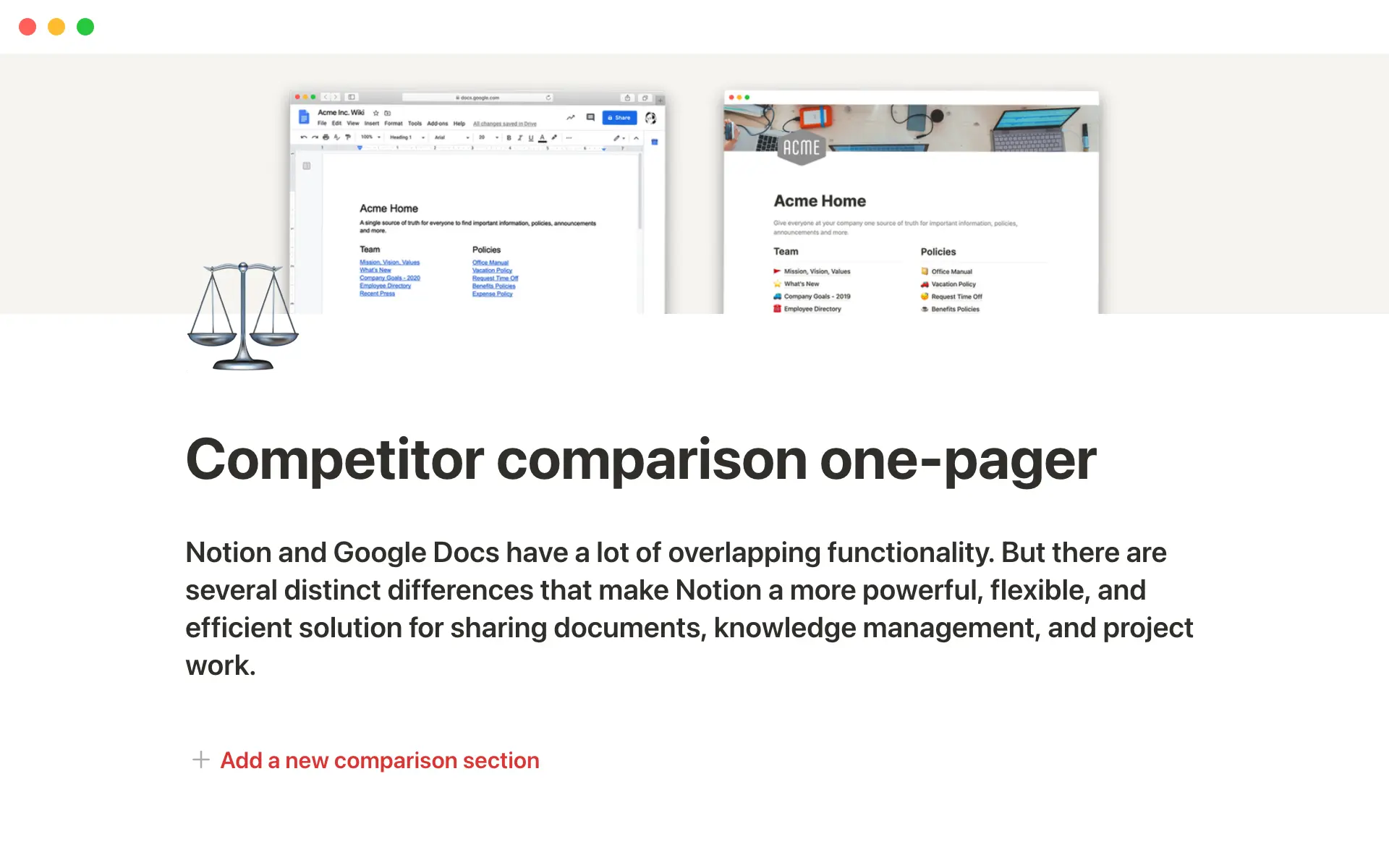 Below, we included one template for competitor comparisons, and one where you can give an overview of your services, tiers, or packages.