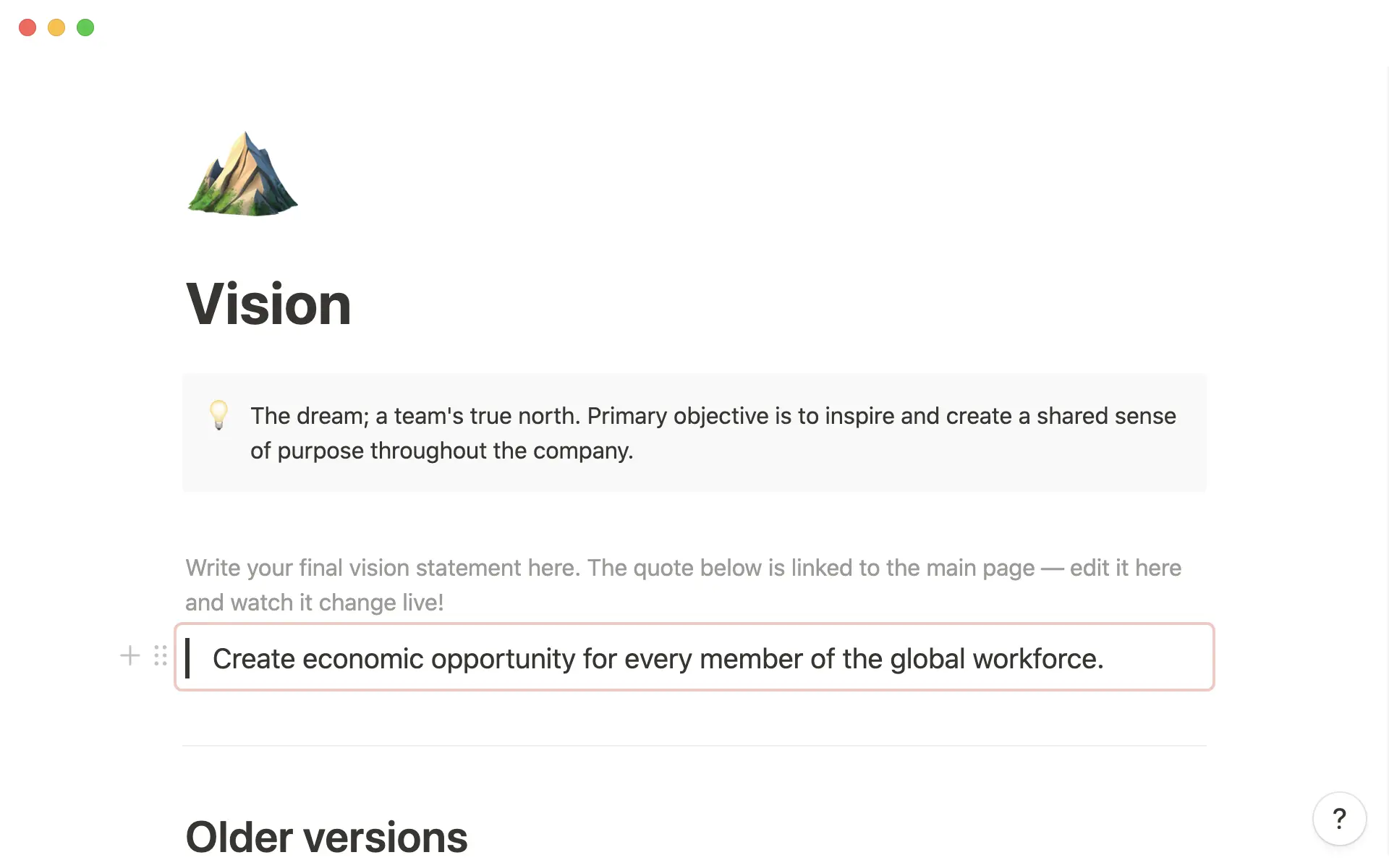 Your Vision to Values one-pager should be visible to everyone in the company, but you also don't want people to delete anything important. To avoid this, you can lock the page so that everyone can access it without accidentally editing it. You can also share the page with certain people and set read-only permissions.