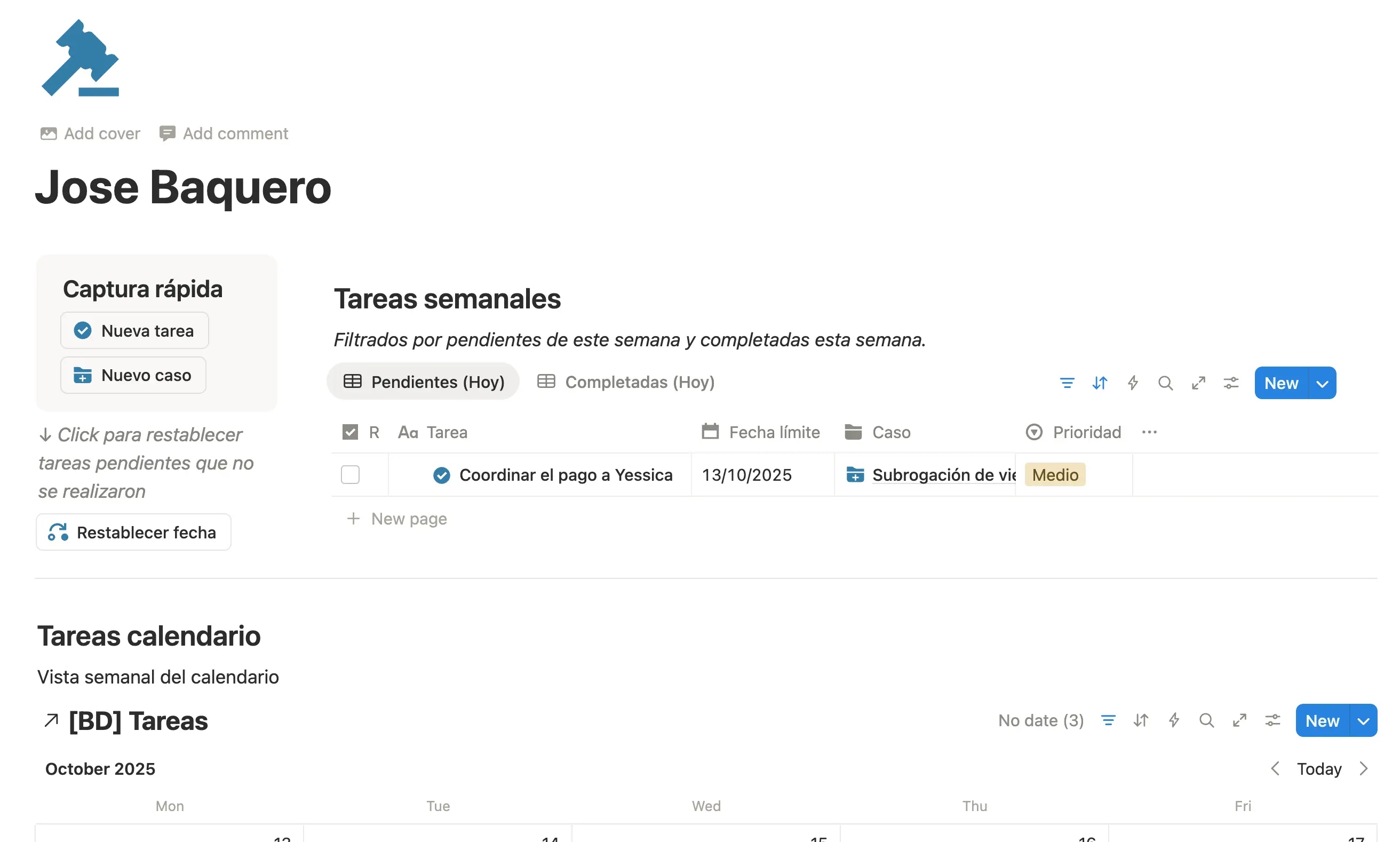 Llegamos con asuntos, tareas y vencimientos repartidos entre correos y hojas de cálculo. Sara nos diseñó en Notion un sistema de Asuntos ↔ Tareas con responsables, y vistas por abogado que ordenó el trabajo desde el día uno. Hoy cada caso tiene su bitácora, el calendario de vencimientos es confiable y el tablero gerencial nos permite priorizar y ejecutar. La documentación que proporcionó Sara facilitaron la adopción del equipo en una semana.D