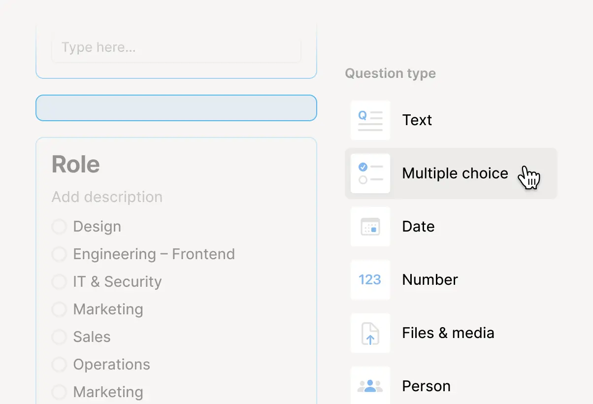Elige entre distintos tipos de preguntas, convierte las preguntas en obligatorias, agrega descripciones y más.